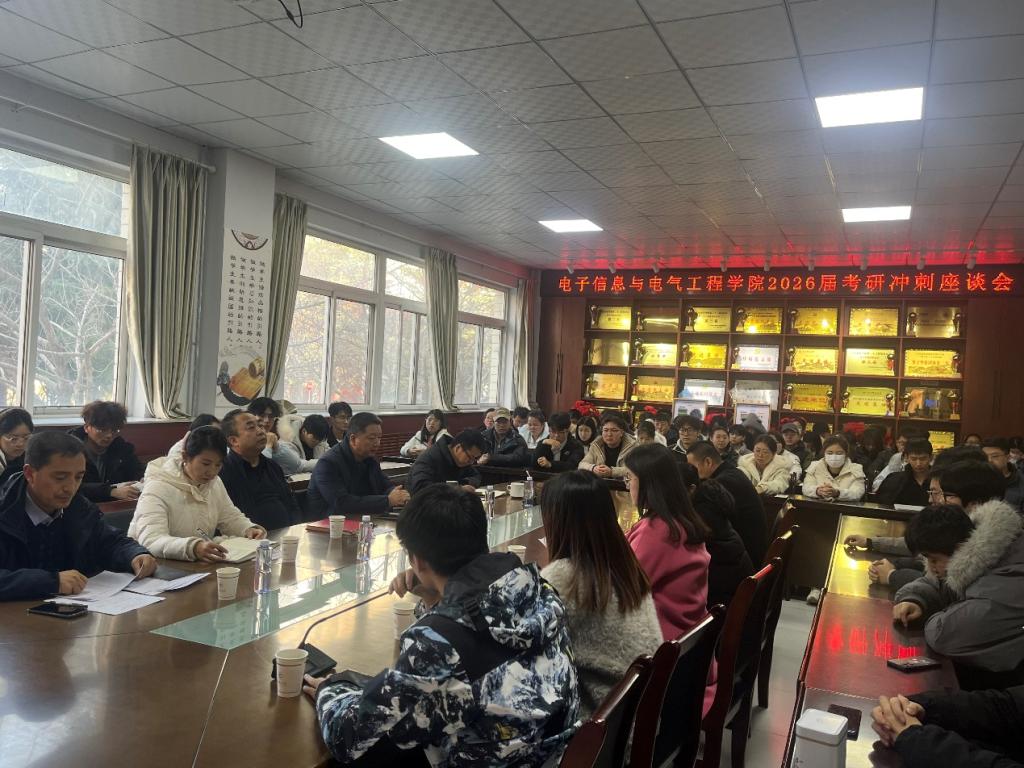 为帮助考研学子缓解备考压力、明确冲刺方向,凝聚奋进力量,12月16日,电子信息与电气工程学院精心组织2026届考研冲刺座谈会,学院领导班子成员及毕业班班主任、全体考研学生参会,会议由师应龙副院长主持。