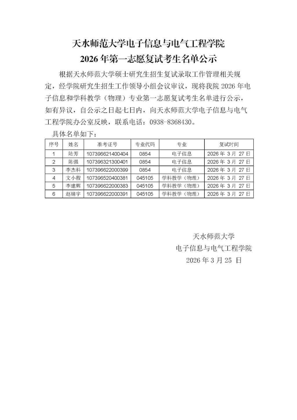 天水师范大学电子信息与电气工程学院2026年第一志愿复试考生名单公示